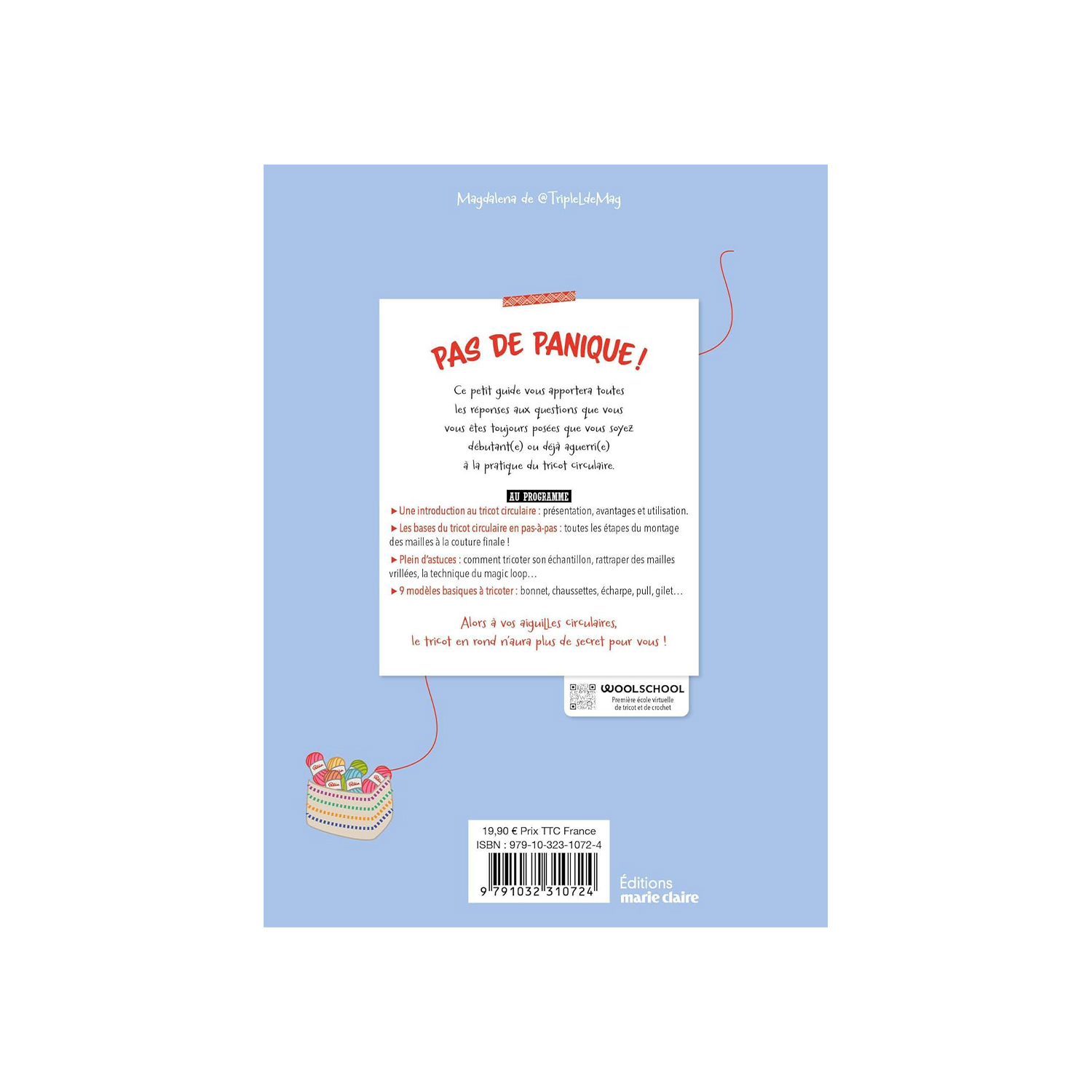 Référence : Pas de Panique - Tricot Circulaire -"Le guide spécial débutants pour se lancer au tricot circulaire : pas de panique ! Tricoter en rond n’a jamais été aussi simple qu’avec ce petit guide spécial grands débutants. Fourmillant de conseils et astuces pour apprendre à tricoter en rond, il répond à toutes les questions ! Au programme : les bases du tricot en rond, les points et techniques de base et des modèles simples et faciles à réaliser. Cet ouvrage est l’occasion idéale de commencer le tricot et de tester la technique du tricot en rond. Auteur : Magdalena Auvinet (@TripleLdeMag) Nombre de pages : 128