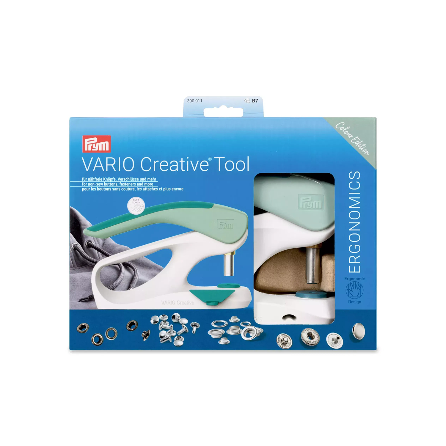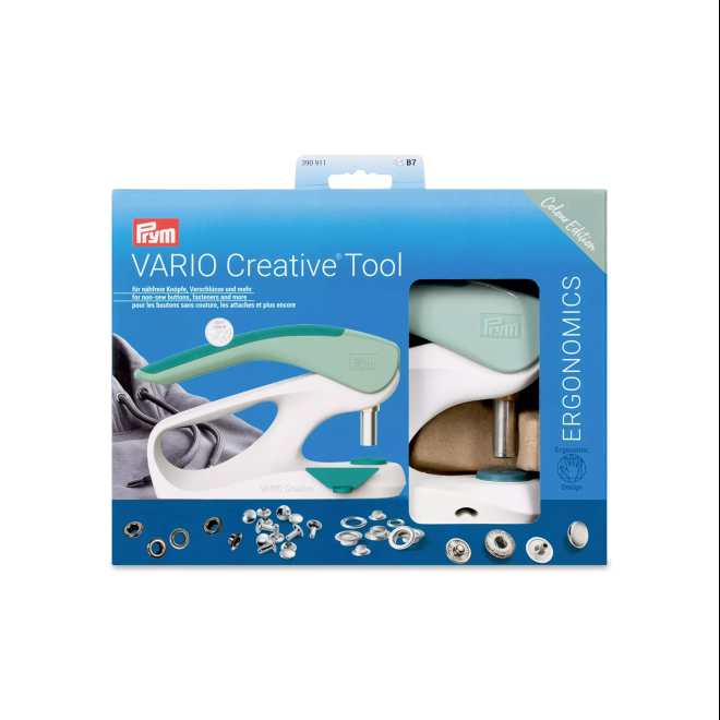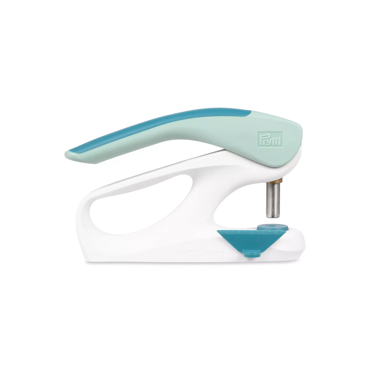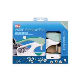 Décorer un jean avec des rivets, poser des bouton-pression sur des vêtements pour bébé ou percer un tissu pour un sweatshirt à capuche et poser des œillets – avec le Vario Creative Tool les produits sans couture de Prym peuvent être utilisés très facilement et avec peu d'effort. Grâce au levier ergonomique avec sa surface soft touch, il est agréable au toucher et ne glisse pas. Les mesures longueurs et largeurs, les pieds en plastique pour une bonne stabilité et la possibilité d’ajustement précis de la force de pression permettent un travail précis et sans fatigue. Percer un trou est très facile : Relever le levier, insérer les outils de perçage et positionner le tissu. Après abaisser le levier, fixer et percer le tissu. C’est pratique : Des outils de perçage de différentes tailles sont déjà inclus. De plus, le Vario Creative Tool est compatible avec tous les jeux d’outils et les produits de la gamme Prym sans couture – un avantage certain du Vario Creative Tool. La fixation sur table, qui est vendu séparément, augmente la stabilité. En plus, le Vario Creative Tool dans les couleurs de Prym ergonomiques blanc albâtre, violet et lilas est d’un design très agréable.